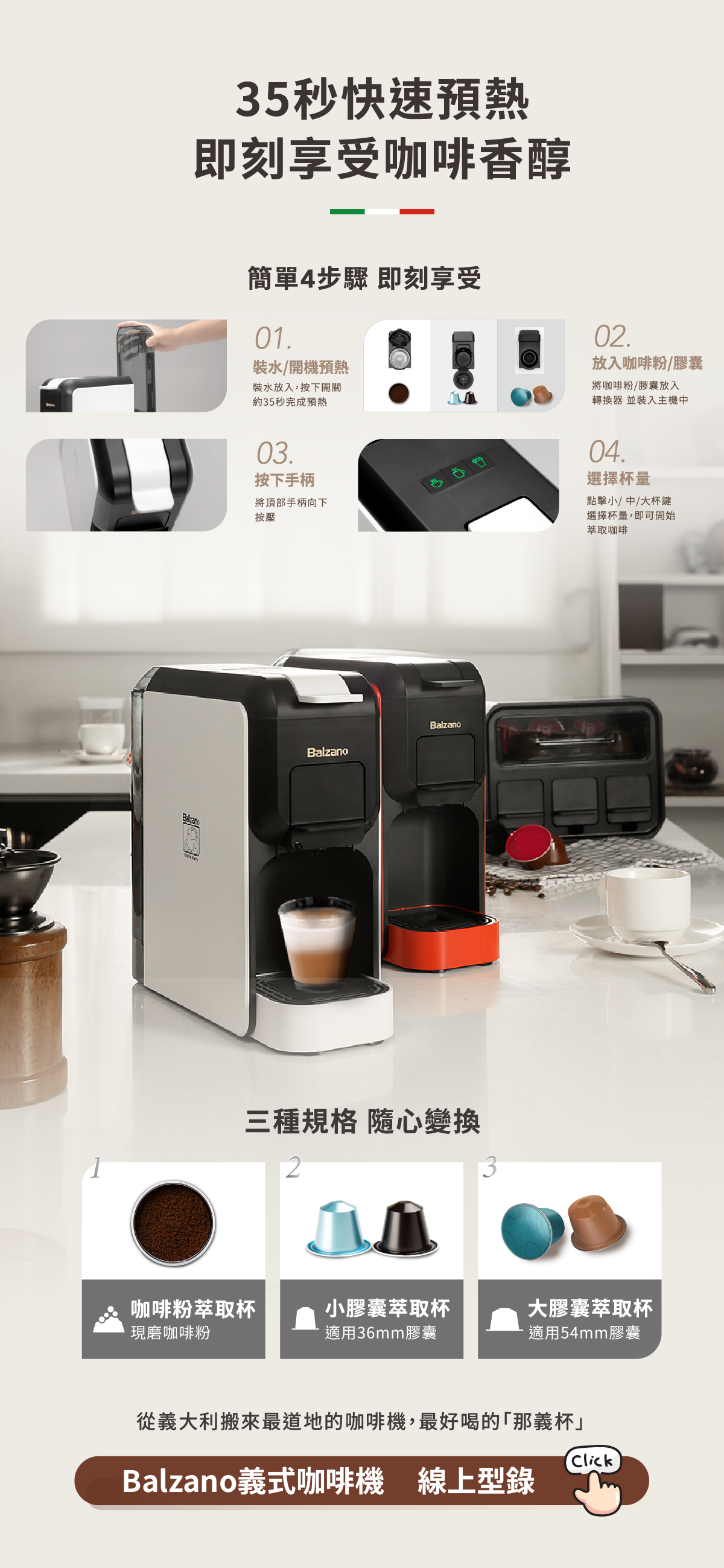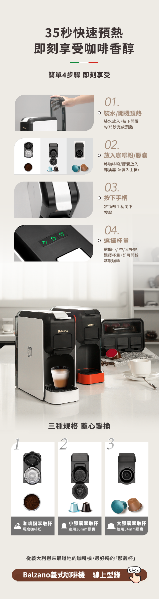 - B.參加者自完成登錄起,每人每月限中獎乙次,可獲得市價新台幣5,990元的Balzano三合一義式咖啡機乙台;若當月未中獎,其抽獎資格將自動保留至下個月度抽獎;若參加者擁有多個抽獎機會,未中獎之機會亦將全數順延,持續享有抽獎資格,直至活動全數結束。