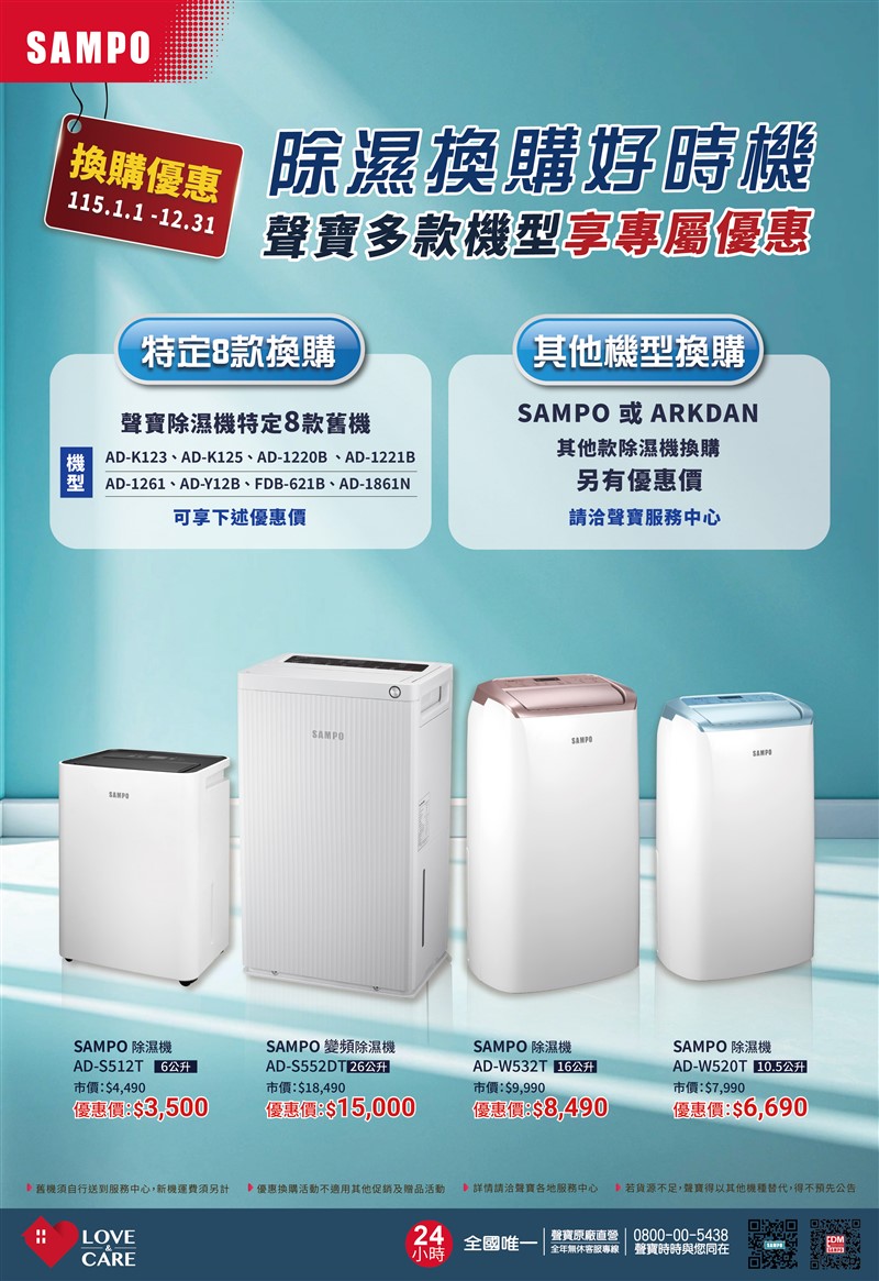 換購聲寶除濕機可享特價優惠(限定機型)115.1.1-12.31