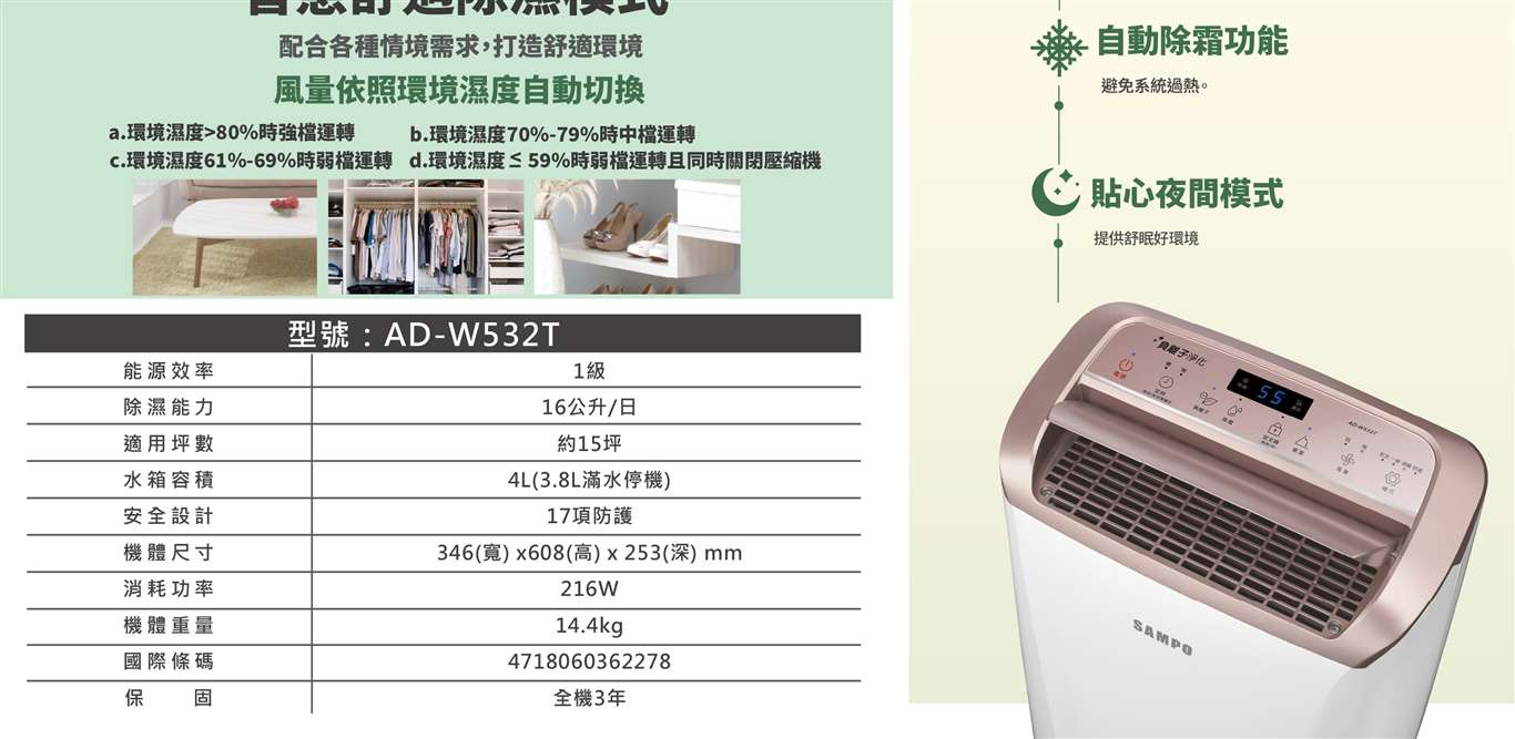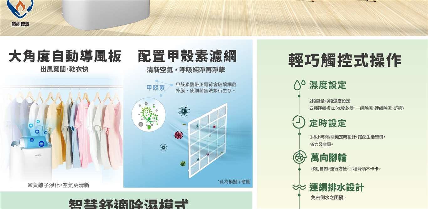 微電腦控制面板 負離子淨化 自動除霜 萬向滑輪、兒童安全鎖 迴轉式壓縮機 自動導風板 甲殼素濾網、夜間模式 除溼能力16L(日) 4.0L水箱(水滿3.8L) 1-8小時定時設定 9段濕度設定、強弱風速 智慧乾衣、舒適模式