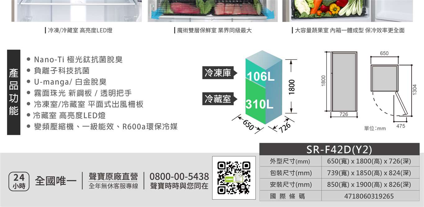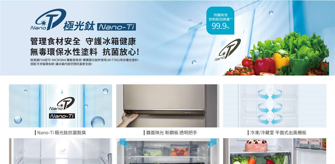 Nano-Ti 極光鈦抗抗菌、Umanga、白金脫臭 兩用保鮮室設計 彈性靈活空間使用 全新外觀鋼板 內裝質感提升(深色透明件) 冷凍室、冷藏室 平面式出風柵板 冷凍室、冷藏室 高亮度LED燈 變頻壓縮機、一級能效、R600a環保冷媒