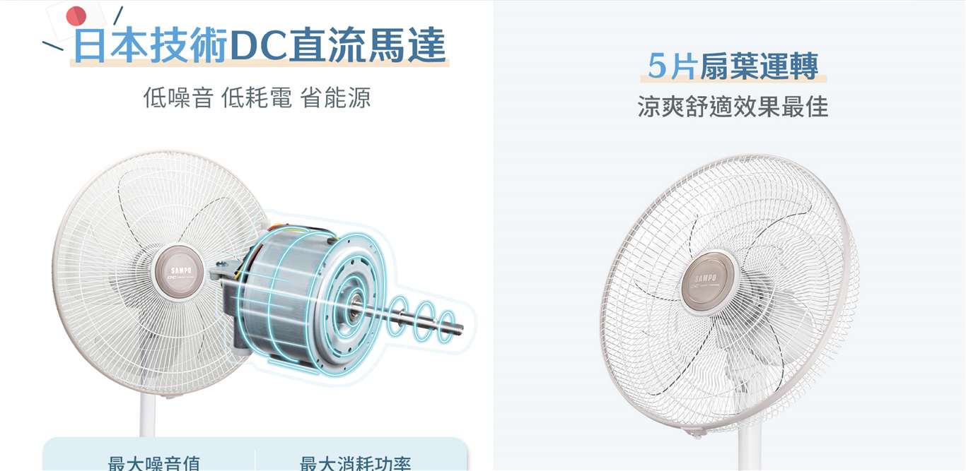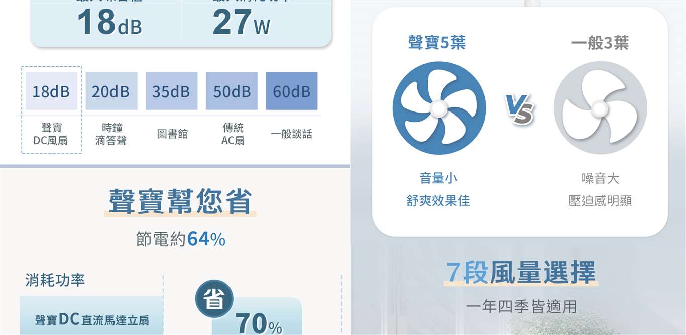 五片扇葉運轉,涼爽舒適 18dB超靜音,全包覆式日本技術DC馬達 7段風量調整 3種風型選擇(一般風、舒眠風、自然風) 1~9小時定時開、關機 靜音設定+熄燈按鍵,夜晚不擾眠 關機記憶功能,操作便利 最低耗電3.5W,每月不到1度電 俯仰角度可調,高度無段式自由調整 無線遙控器,操作輕鬆 新型底座,輕巧易拆裝 膠墊設計,保護地面防刮