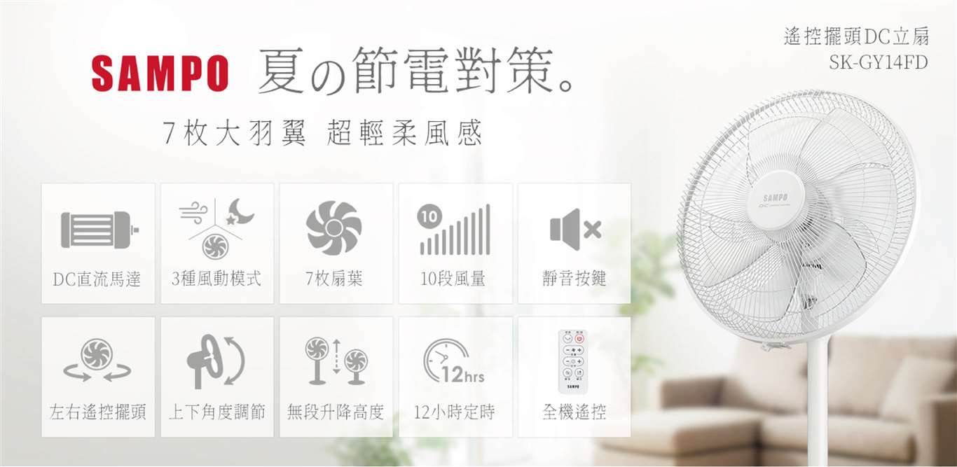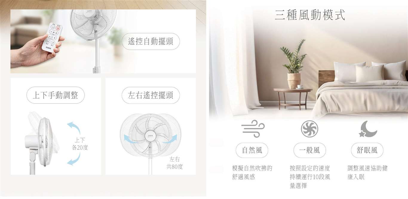 7片扇葉,風感柔和舒適 左右遙控擺頭+智慧遙控器,操作輕鬆 DC直流靜音馬達,全包覆式設計 每月不到1度電,省能源低耗電 三種風型(一般風、舒眠風、自然風) 10段風量選擇,四季皆宜 1~12小時定時關機 自動熄燈+靜音設計,夜晚操作不擾眠 遙控器收納架,整齊便利 扇葉帽內置銅製螺母,堅固耐用 無段式升降,高度自由調整