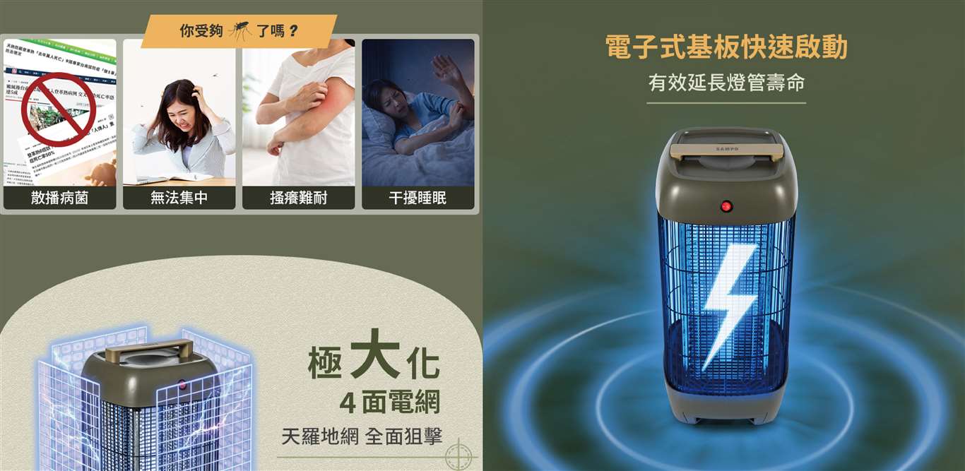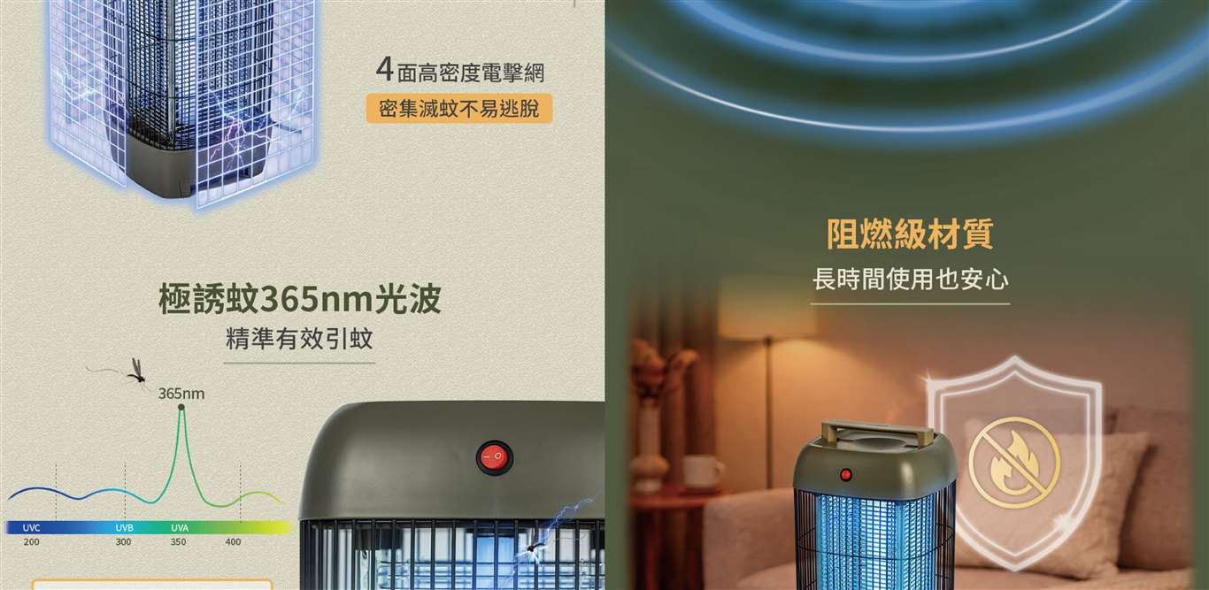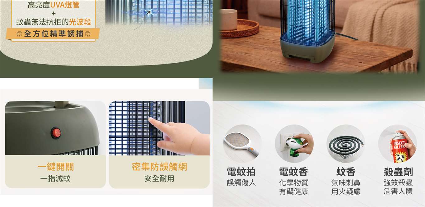 全機高亮度UVA 燈管,365nm光波精準引蚊 電子式基版快速啟動,延長燈管壽命更耐用 高密度四面電擊網,擴大電擊範圍蚊蟲難脫逃 密集安全護網,堅固耐用 一鍵開關設計,操作簡單便利 環保抽屜式集蚊盒,拆卸容易清潔方便 隱藏式把手,輕鬆移動不費力 採用阻燃級材質,使用安全有保障 附清潔刷