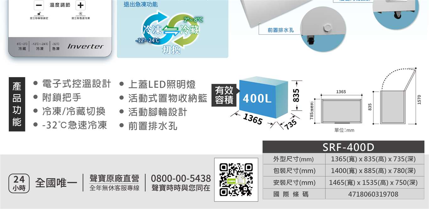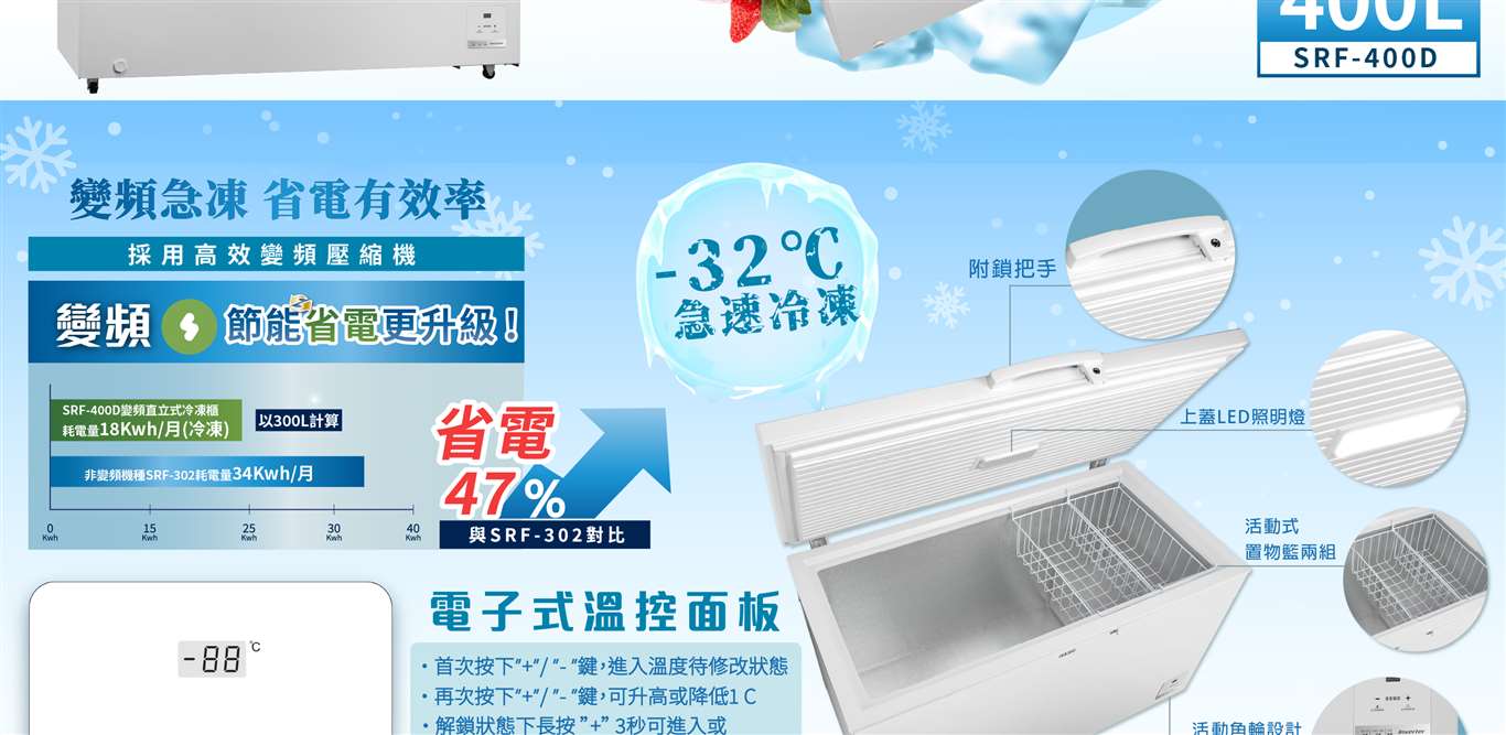 變頻直冷式冷凍櫃 冷凍、冷藏切換 冷藏 2~8C 、 冷凍 -12~-24C 電子式控溫設計,急凍模式-32C 全機防火底板 活動式置物收納籃*2組 四星級冷凍能力 上蓋LED照明燈 活動腳輪設計 R600a環保冷媒 附鎖把手設計 箱體防凝露設計 全機鐵殼防火設計 密封式防鼠鐵製底板